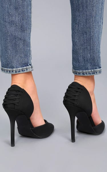 Pair the Alessa Black Nubuck D’Orsay Pumps with a leather mini skirt for a look that can’t be beat! Trendy, black vegan nubuck covers a pointed toe upper, that carries into a D’Orsay vamp and structured heel cup, with lace-up detail.